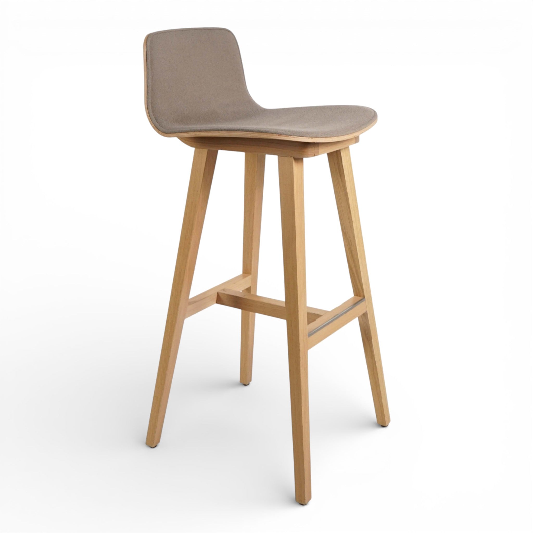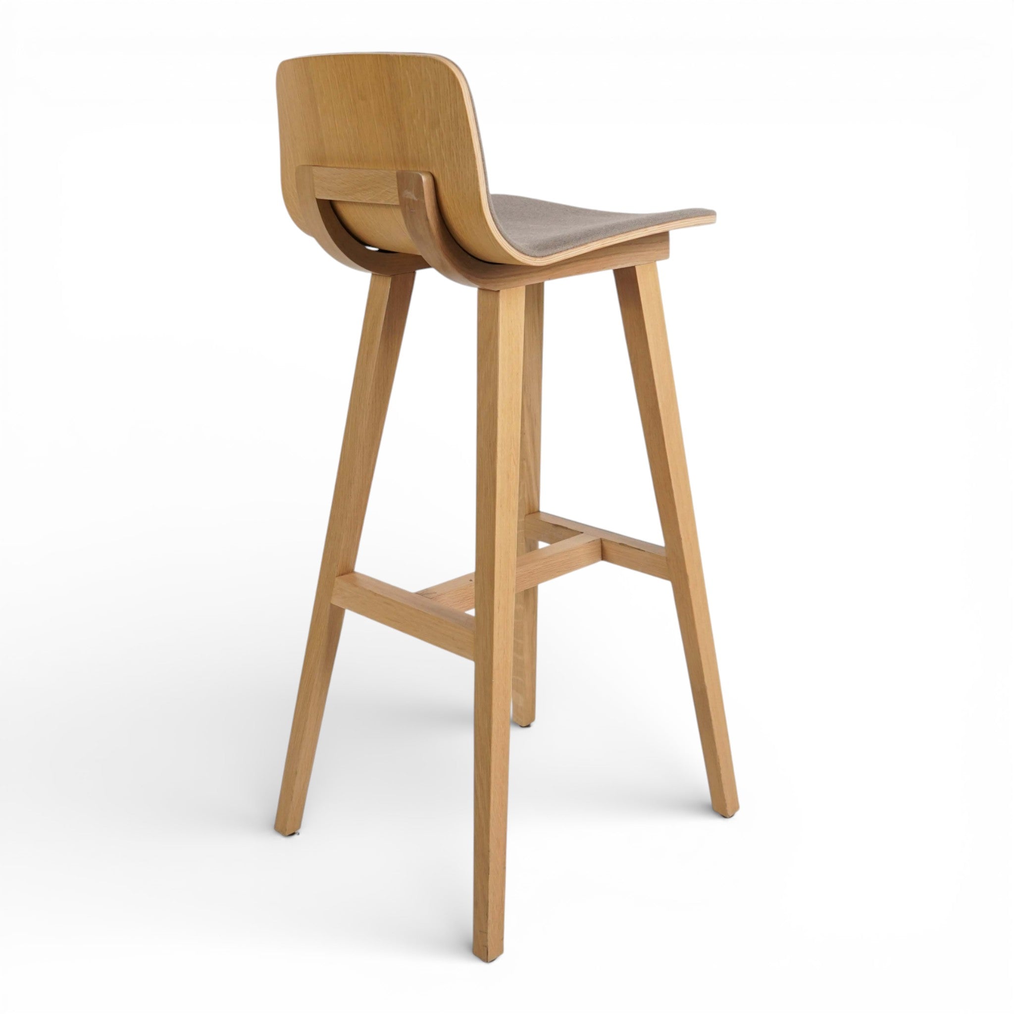 Barkrakk fra Alki i heltre med sete trukket i brunt filtstoff. Produktet kombinerer naturlige materialer med funksjonalitet. Stolen har en nordisk designprofil som passer inn i profesjonelle miljøer.